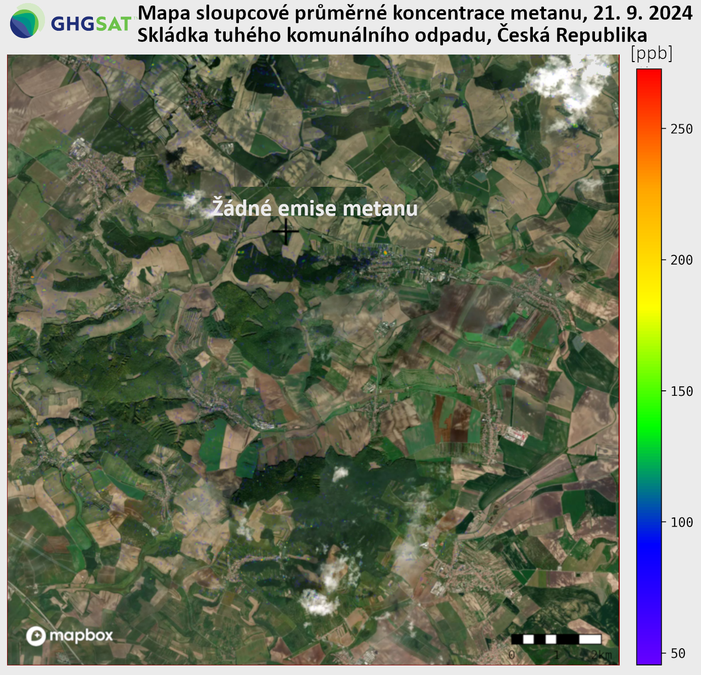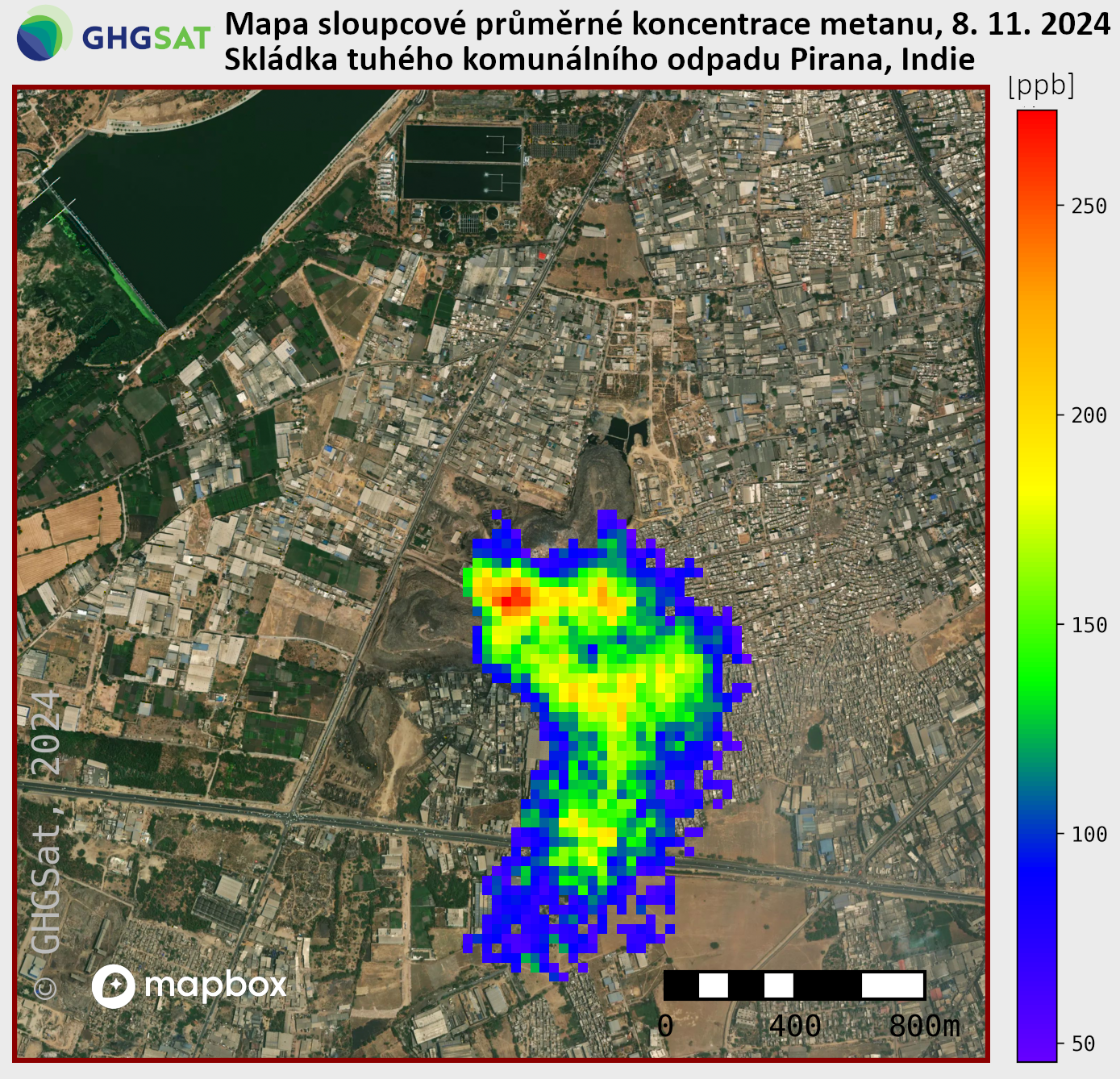 Detekce vysokých emisí metanu pomocí satelitu GHGSat. Mapa ukazuje rozložení koncentrace metanu (CH₄) v atmosféře ve svislém sloupci nad konkrétní oblastí. Hodnoty na mapě představují průměrné množství metanu ve vzduchu od zemského povrchu až po horní vrstvy atmosféry v dané lokalitě.